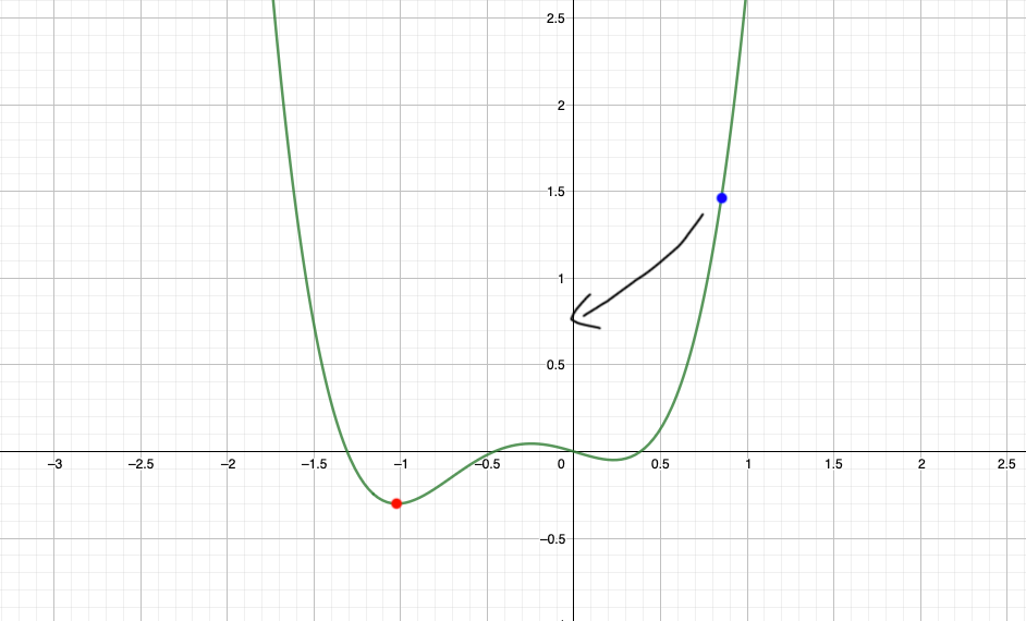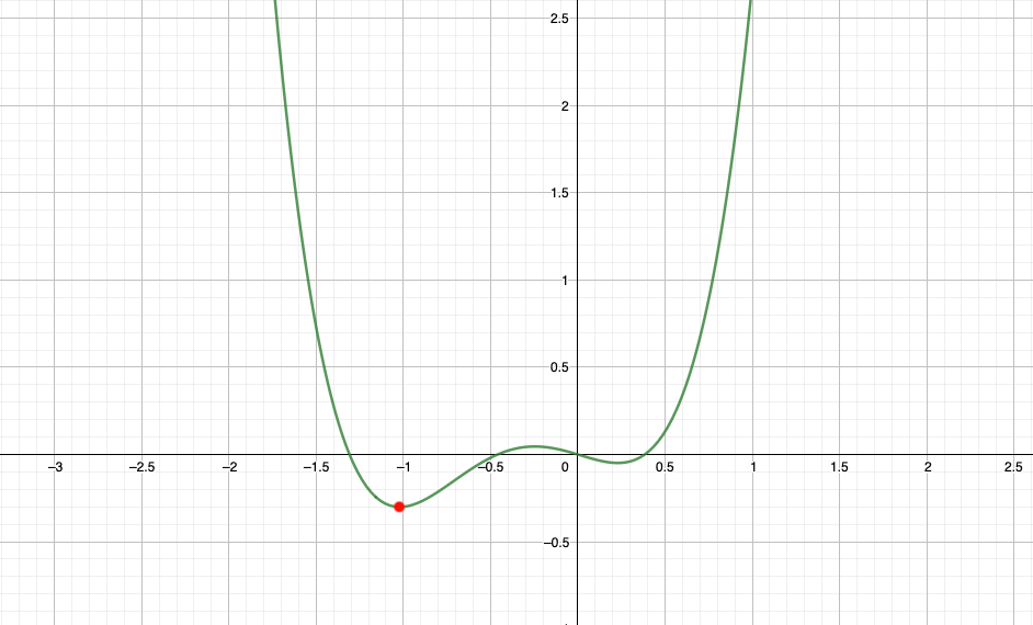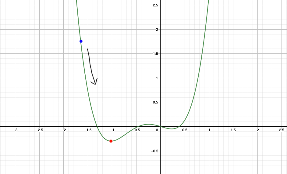 다음과 같은 함수가 있다고 가정해보자. 가로축은 $x$이고, 세로축은 $y$이다. 이 함수에서의 최솟값은 빨간색 점이 찍혀있는 곳이다.