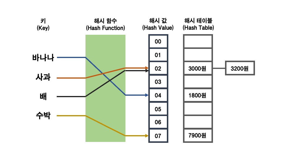사과의 경우, 해시 함수를 통해 산출된 해시 값이 02로, 해시 테이블의 02번 인덱스가 가리키는 곳에 사과의 가격인 3000원이 저장된다.