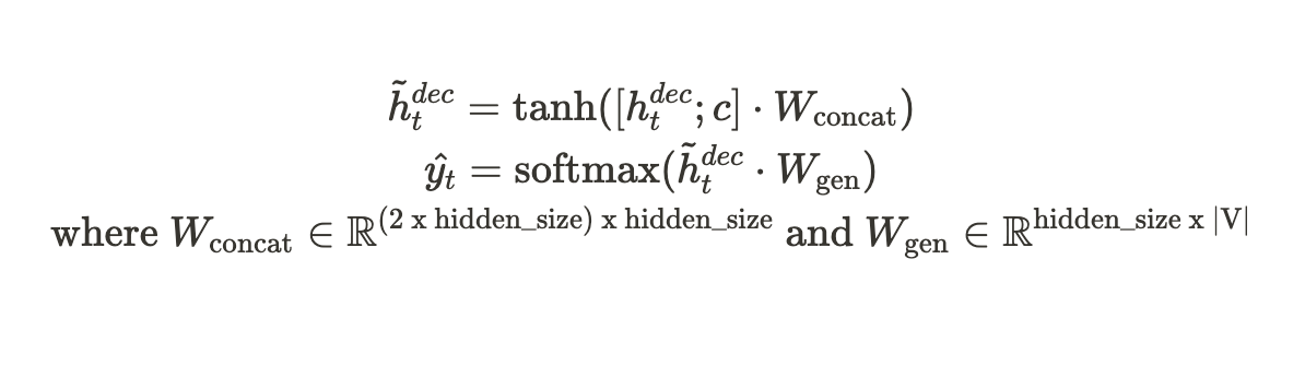 이후, 원래의 hidden size로 차원 축소를 해주기 위해 $W_{\text{concat}}$을 곱해주고, 여기에 탄젠트-하이퍼볼릭 함수를 적용시키면서 $\tilde{h}_t^{dec}$를 얻게 된다 (위에서의 과정 5)
