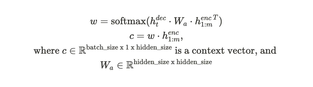 계산된 context vector $c$의 shape은 (batch size, 1, m) x (batch size, m, hidden size) = (batch size, 1, hidden size)가 된다