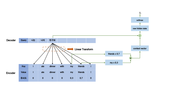 - 각 timestep별 Key와 Query(여기서는 decoder의 output "친구와")의 유사도를 구함