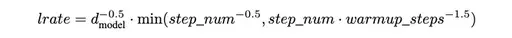 즉, warmup_step에 따라 linear 하게 learning rate을 증가시키다가, step_num에 따라 square root 한 값을 통해 점진적으로 learning rate를 줄여나갔다. (논문에서는 warmup_steps = 4000으로 설정했다고 한다)
