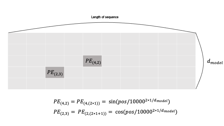 $PE_{2,3}$부분을 먼저 보자. $PE_{2,3}$이란, sequence에서 해당 단어의 위치인 position, $pos$는 2이며, Positional Encoding vector의 dimension인 $i$는 3이기 때문에, 가로 3번째, 세로 4번째의 칸에 위치해있다.(0부터 시작한다)