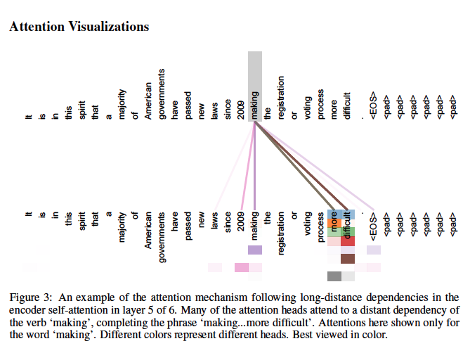 추가적으로, self-attention은 아래의 그림과 같이 interpretable(설명 가능한) 모델이라는 장점도 가지고 있다.