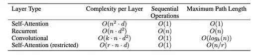 계산 복잡도 측면(computational complexity)에서 바라봤을 때, self-attention layer는 $n$(sequence length)이 $d$(representation dimensionality) 보다 작을 때 RNN 계열의 아키텍처보다 더 적은 계산 복잡도를 가지는 것을 알 수 있다.