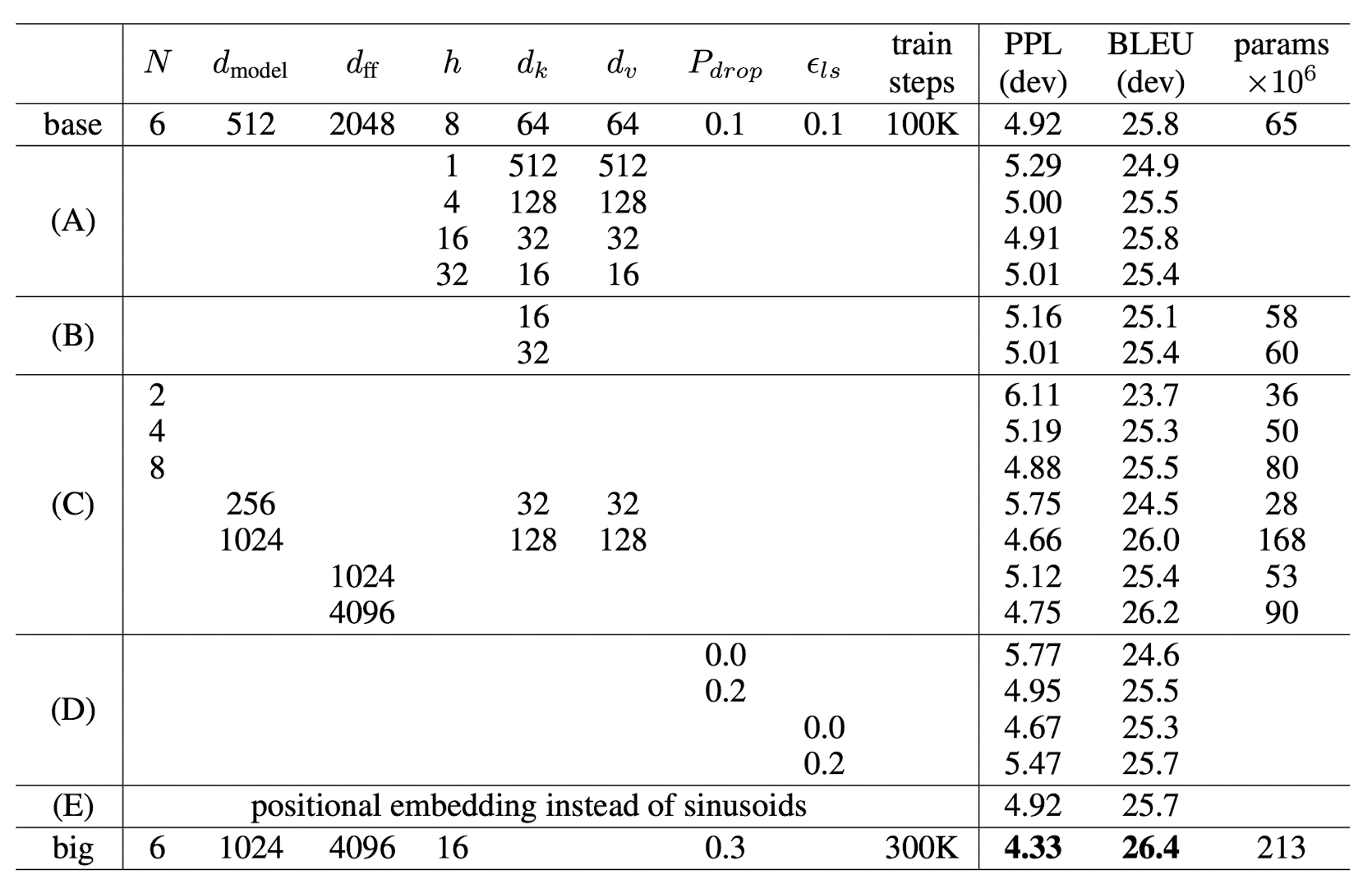 - (E)에서는 논문에서 제시한 Positional embedding 기법이 아닌, Facebook이 ConvS2S를 발표할 때 제안한 Learned positional embedding을 써도 성능상의 차이가 없다는 것을 알 수 있다.