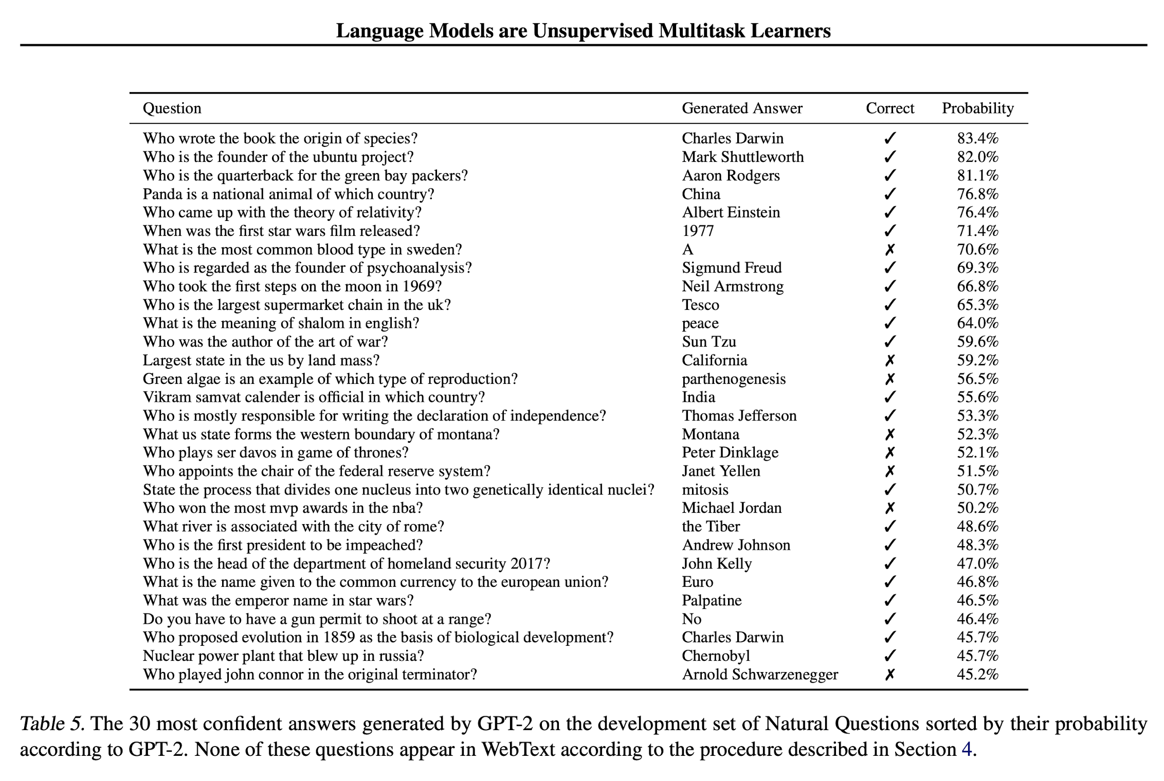 GPT-2가 생성된 answer에 대해 할당하는 확률(해당 answer에 대한 확률)은 잘 calibrated 되어있는데, 실제로 GPT-2가 가장 신뢰할 수 있는 답변이라고 한 1%(probability가 높은 1%의 answer)에 대한 accuracy는 63.1%이었다.