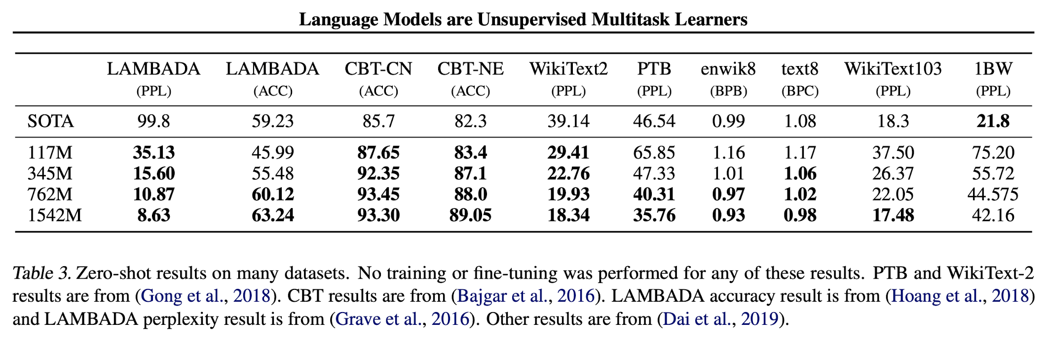 Large language model이 충분히 크고 다양한 dataset에서 학습된다면 많은 domain과 dataset에서 잘 작동할 수 있다. GPT-2는 zero-shot setting에서 SOTA를 달성하였고,(8개의 dataset 중 7개), 이러한 model이 zero-shot setting에서 잘 작동할 수 있는 task의 다양성은 충분히 다양한 text corpus에서 학습된 high-capacity의 model이 supervision없이도 다양한 task를 수행하는 방법을 학습한다는 것을 시사한다.