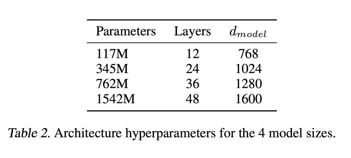 위에서부터 아래 순서대로 model의 크기가 커지며, 가장 작은 model은 GPT1의 크기와 동일하고, 2번째로 큰 model은 BERT-LARGE와 같은 크기이다. 저자들은 해당 model들 중에서 가장 큰 model을 GPT-2라고 소개한다.
