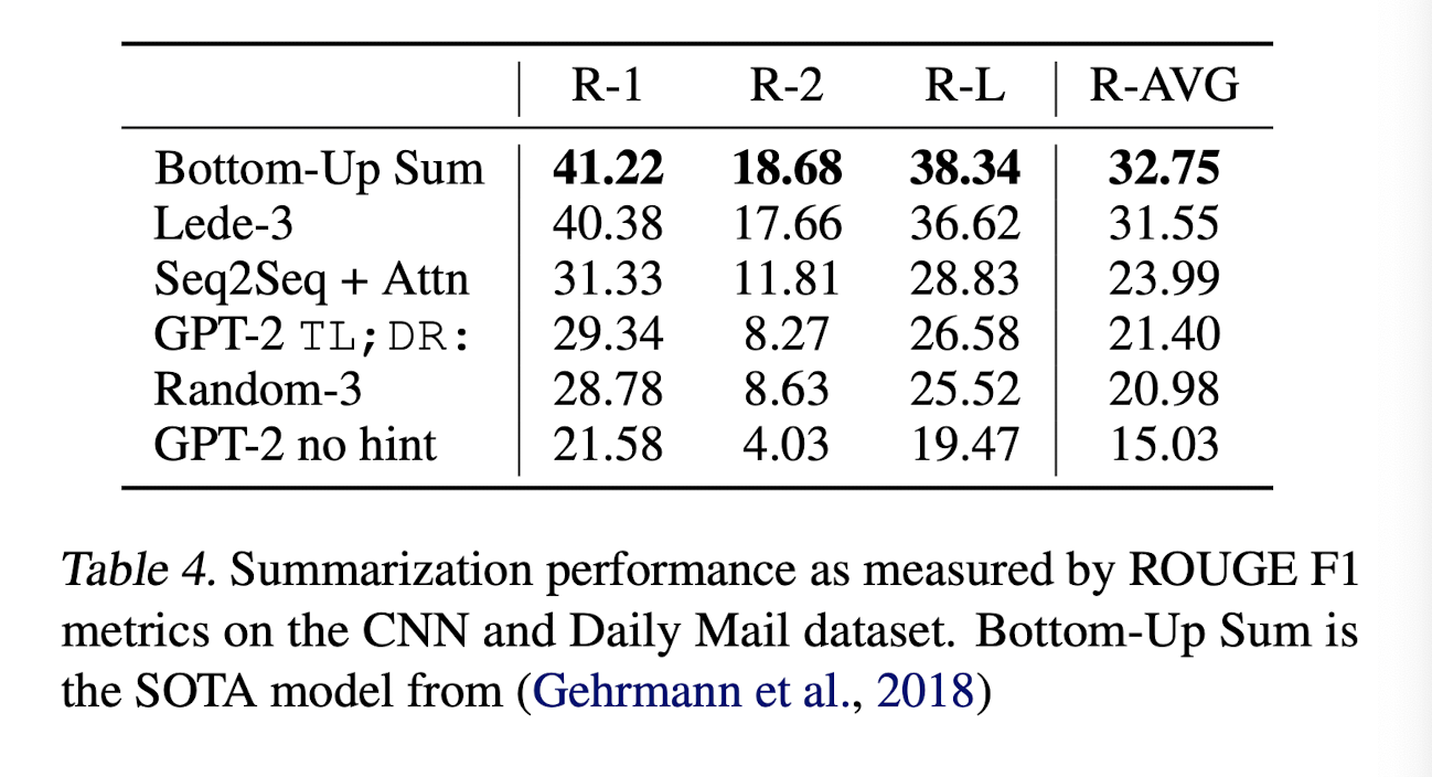 GPT-2가 이러한 summarization task에서는 잘 작동하지 않음을 확인할 수 있다.