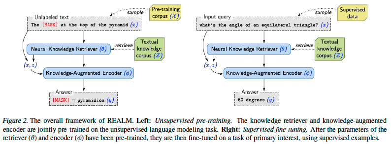 저자들은 이러한 문제를 해결하기 위해, task 수행을 위한 knowledge를 제공하는 knowledge retrieval를 language model과 결합시키고, 두 요소를 한 번에 pre-training 시키는 새로운 model인 Retrieval-Augmented Language Model(REALM)을 소개한다.