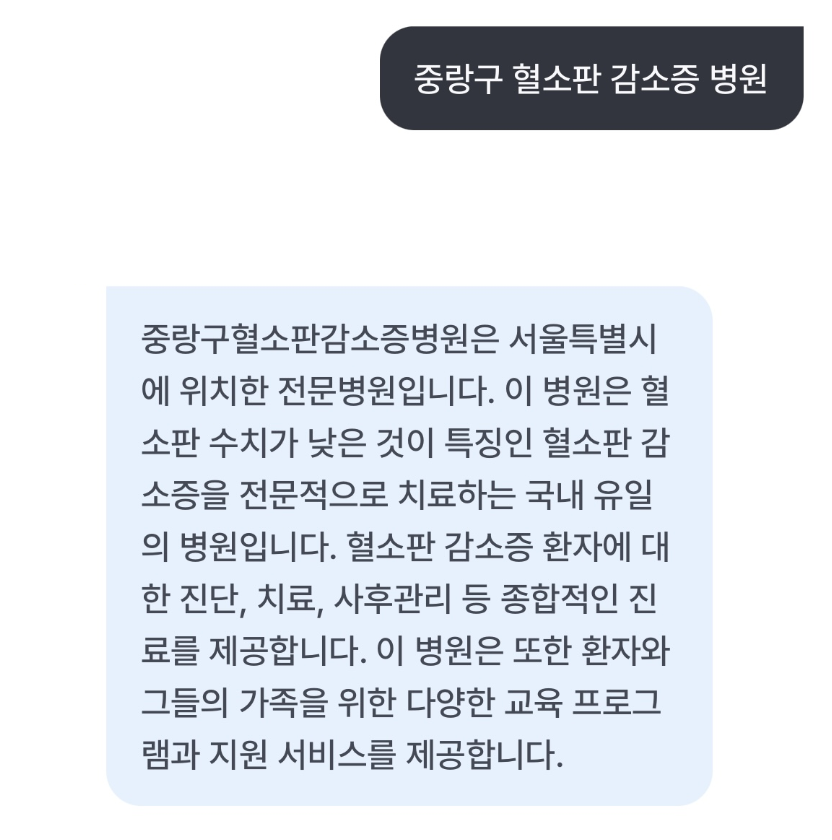 물론, 사람처럼 잘 말하고 만족스러운 답변을 주는 경우가 대다수이지만, query에 대한 output을 산출할 때, 특정 정보가 필요한 경우에는 세상에 없는 사실을 마치 사실인 것처럼 대답하는 모습을 볼 수 있다. (중랑구 혈소판 감소증 병원은 세상에 없는 병원이다.)