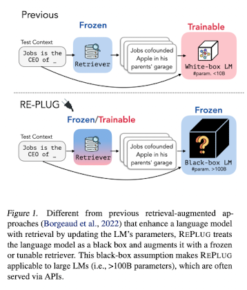 저자들은 논문에서 제시하는 REPLUG는 이러한 기존의 한계를 극복하고, black-box LM에도 적용 가능한 retrieval-augmented language model이라고 소개한다.