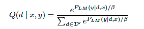 이 또한 각 document별 $P_{LM}(y|d,x)$에 대해 softmax를 취한 값이다. 또한, 여기서의 $\beta$ 또한 위에서의 $\gamma$와 같은 역할을 하는 hyperparameter이다