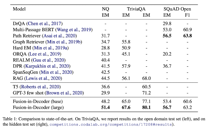 우선, FiD-LARGE가 모든 dataset에서 SOTA 혹은 그에 비슷한 성능을 내는것을 확인할 수 있었다.