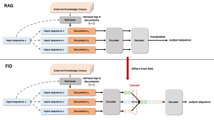 즉, RAG와 다르게, FiD는 여러 document에 대한 Encoder의 output을 concat함으로써, Decoder에서 한번에 처리한다는 차이점이 있다.