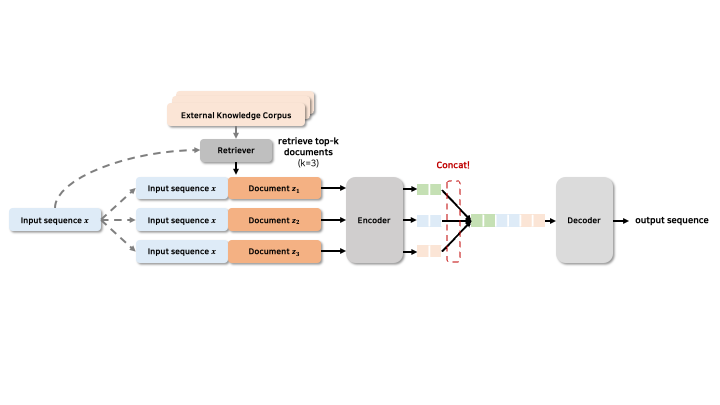 (external knowledge corpus는 여러 document로 이루어져 있다. top-k document를 가져온다는 것은 corpus 중에서 input과 유사한 부분을 가져온다는 뜻이다)