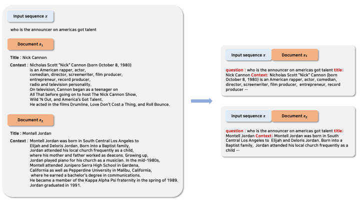기본적으로는 input sequence $x$와 각각의 document를 concat하는 구조이다. 여기에 추가적으로, "question: ", "title: ", "context: " 의 special token을 추가해준다. 위의 figure에서의 빨간 단어들이 그 예이다.