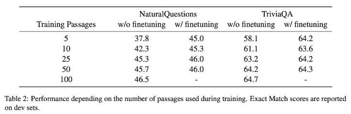 마찬가지로, training에 사용되는 document(passage) 개수가 적을수록, 성능이 하락하는 것을 확인할 수 있다.