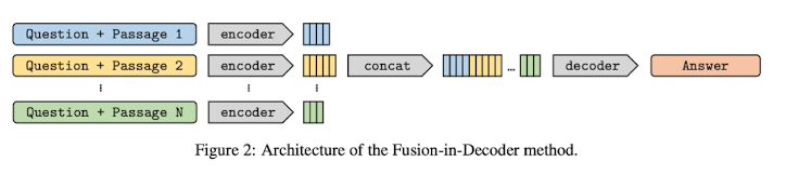 FiD 구조는 기본적으로 RAG와 같이 retriever와 Encoder-Decoder 구조로 구성된 generator로 구성되어있다. 전반적인 원리 및 구조는 RAG와 비슷하나, Encoder에서 Decoder로 이어지는 부분에서 RAG와 FiD는 차이를 보인다.