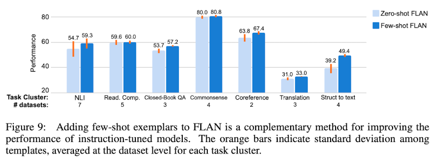 이제까지는 zero-shot setting에 대한 실험들이었다. 저자들은 이에 더해 few-shot setting에서도 instruction tuning이 성능에 긍정적인 영향을 미치는지 확인하고자 추가적인 실험을 진행하였다.
