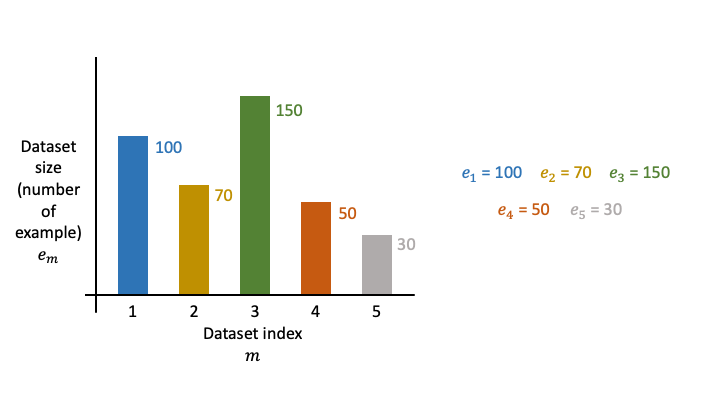 수행해야 할 여러 task의 개수를 $N$이라고 해보자. 그리고, 각각의 task에 대응되는 dataset을 $e_{n}, n \in \{1, \dots , N\}$이라고 하자. 또한, 여러 task들 중 임의의 task를 뽑았을 때, 해당 task의 index를 $m$이라고 한다.