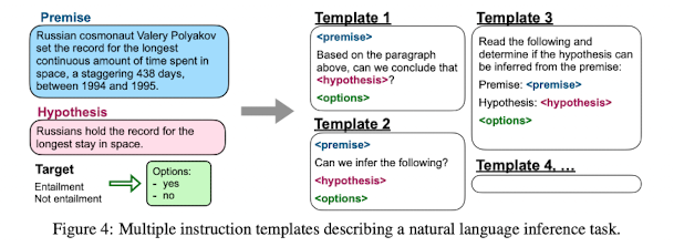 위 figure는 FLAN model을 제안한 논문의 figure이며, NLI task를 prompt(template)형식으로 변환하는 과정을 나타낸다.)
