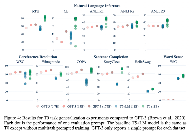 추가적으로, T0 model을 학습시킬 때 GPT-3에서 evaluation 할 때 사용한 data는 사용하지 않았고, 이는 GPT-3와 공정한 zero-shot 성능 비교를 가능케 했다고 한다.