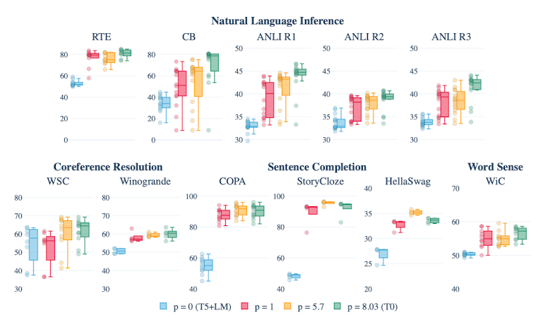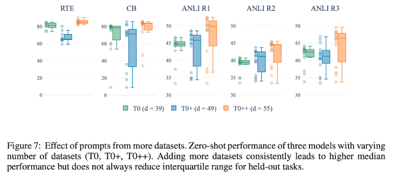 결과를 보면, 흥미로운 점을 목격할 수 있다. 주목해야 할 점은 T0 setting과 T0+ setting이다. 두 setting 사이에는 10개의 dataset 개수 차이가 있는데도 불구하고, T0+의 성능 중앙값 결과와 성능 분포가 T0보다 좋지 않은 경우가 꽤 보인다(RTE, CB, ANLI)
