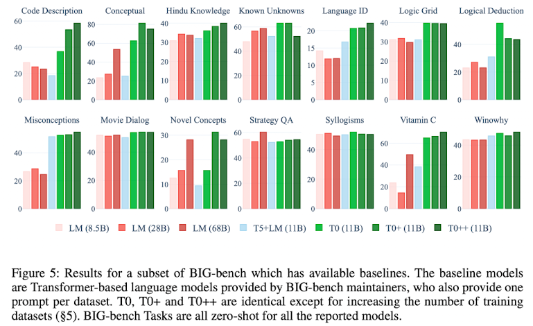 우선, 단순 T5+LM과 비교했을 때, 본 연구에서 진행한 multitask prompted training이 매우 큰 폭으로 성능 향상에 영향을 미친다는 것을 확인할 수 있다.
