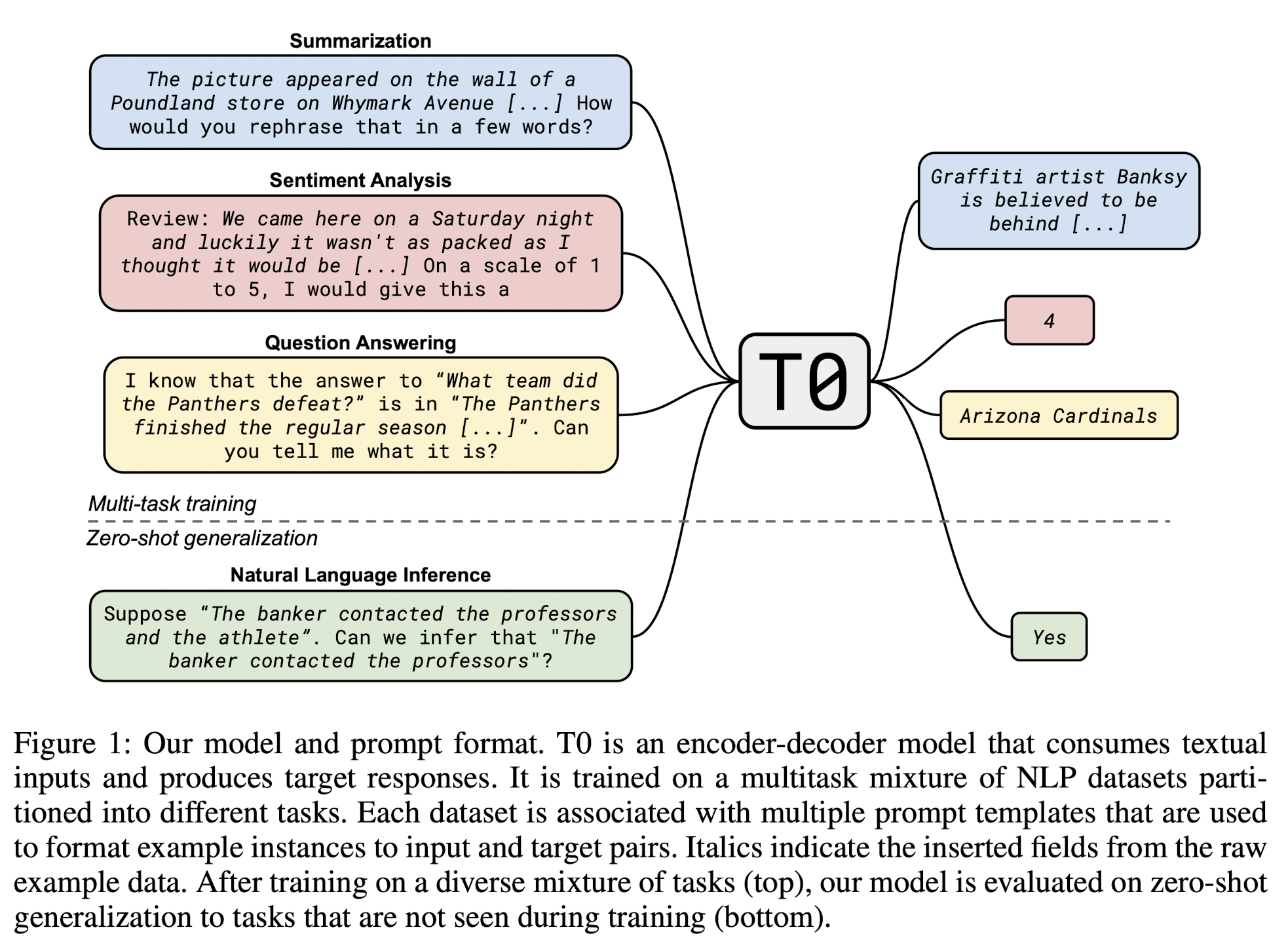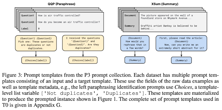 위 figure는 summarization task, sentiment analysis, question answering task를 prompt로 변형시켜 multitask supervised training을 진행한 이후, NLI task를 통해 zero-shot generalization 성능을 evaluation 하는 과정을 나타낸다.