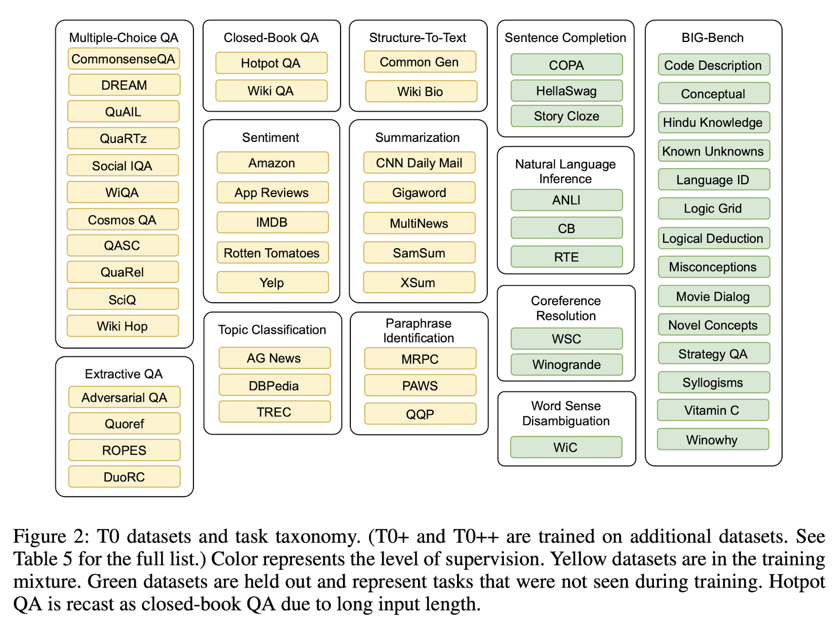 T0 - Multiple-Choice QA: CommonsenseQA, DREAM, QUAIL, QuaRTz, Social IQA, WiQA, Cosmos, QASC, Quarel, SciQ, Wiki Hop- Extractive QA: Adversarial QA, Quoref, DuoRC, ROPES- Closed-Book QA: Hotpot QA*, Wiki QA- Structure-To-Text: Common Gen, Wiki Bio- Sentime