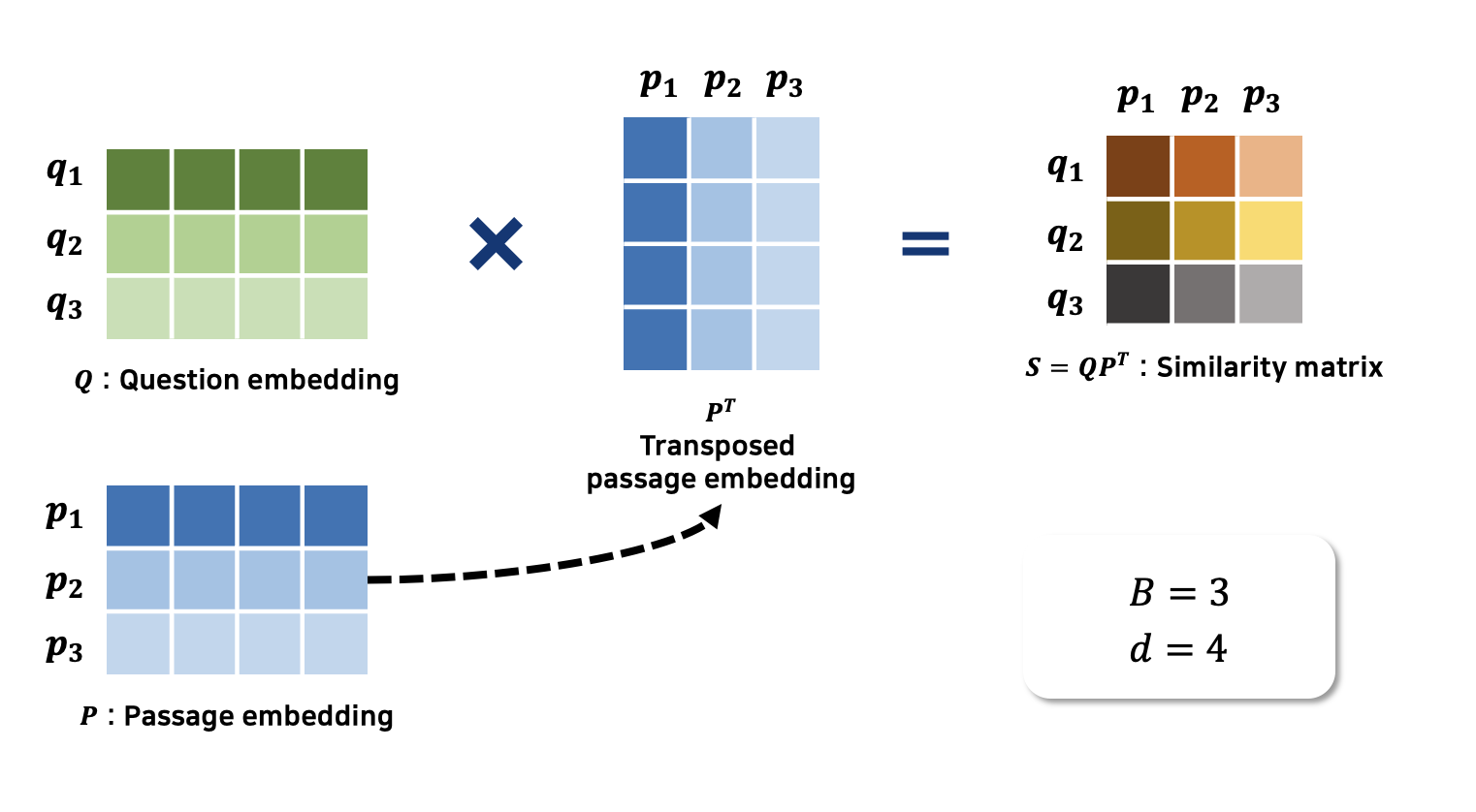 이때, $Q$와 $P$를 각각 $(B \times d)$ 의 question embedding matrix, passage embedding matrix라고 하자.