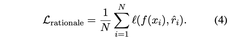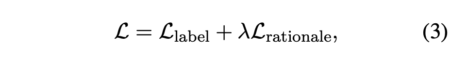 \mathcal{L}_{\text{label}}은 앞서 봤었던 equation 1이며, \mathcal{L}_{\text{rationale}}은 아래와 같다