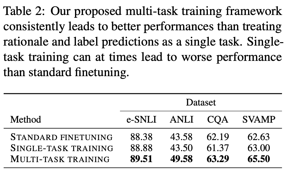 결과를 보면, single-task training이 오히려 standard fine-tuning보다 성능이 하락하는 경우가 발생하는 것을 확인할 수 있다. 저자들은 이에 대해, rationale prediction과 label prediction을 단순히 하나의 joint task로 취급하는 것이 model의 label prediction 성능을 저해시킬 수 있다고 말한다. 결과적으로, 저자들은 본인들의 multi-task training 방법론의 우수성을 주장한다.