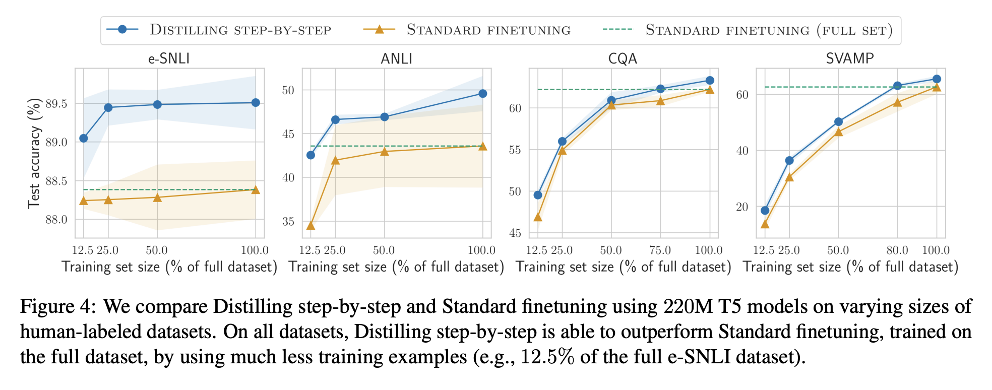 Distilling step-by-step과 standard fine-tuning 모두 training example의 수가 증가할수록 꾸준히 성능 증가가 이루어지는 것을 확인할 수 있다. 또한, 모든 경우에서 distilling step-by-step이 standard fine-tuning보다 더 좋은 성능을 내는 것을 확인할 수 있다. 특히, standard fine-tuning으로는 full training set을 사용해야만 달성할 수 있는 성능을 distilling step-by-step은 작게는 12.5%의 training set만으로도 달성하였다.