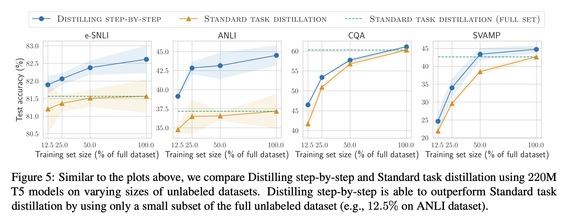Fine-tuning과 비교했을때와 비슷하게, training example의 수가 증가할수록 꾸준히 성능 증가가 이루어지는 것을 확인할 수 있다. 마찬가지로 모든 경우에서 distilling step-by-step이 standard task distillation보다 더 좋은 성능을 내는 것도 확인 가능하며, 작게는 12.5%의 training set만으로도 full training set을 사용한 standard task distillation의 성능을 앞지른 것을 확인할 수 있다.