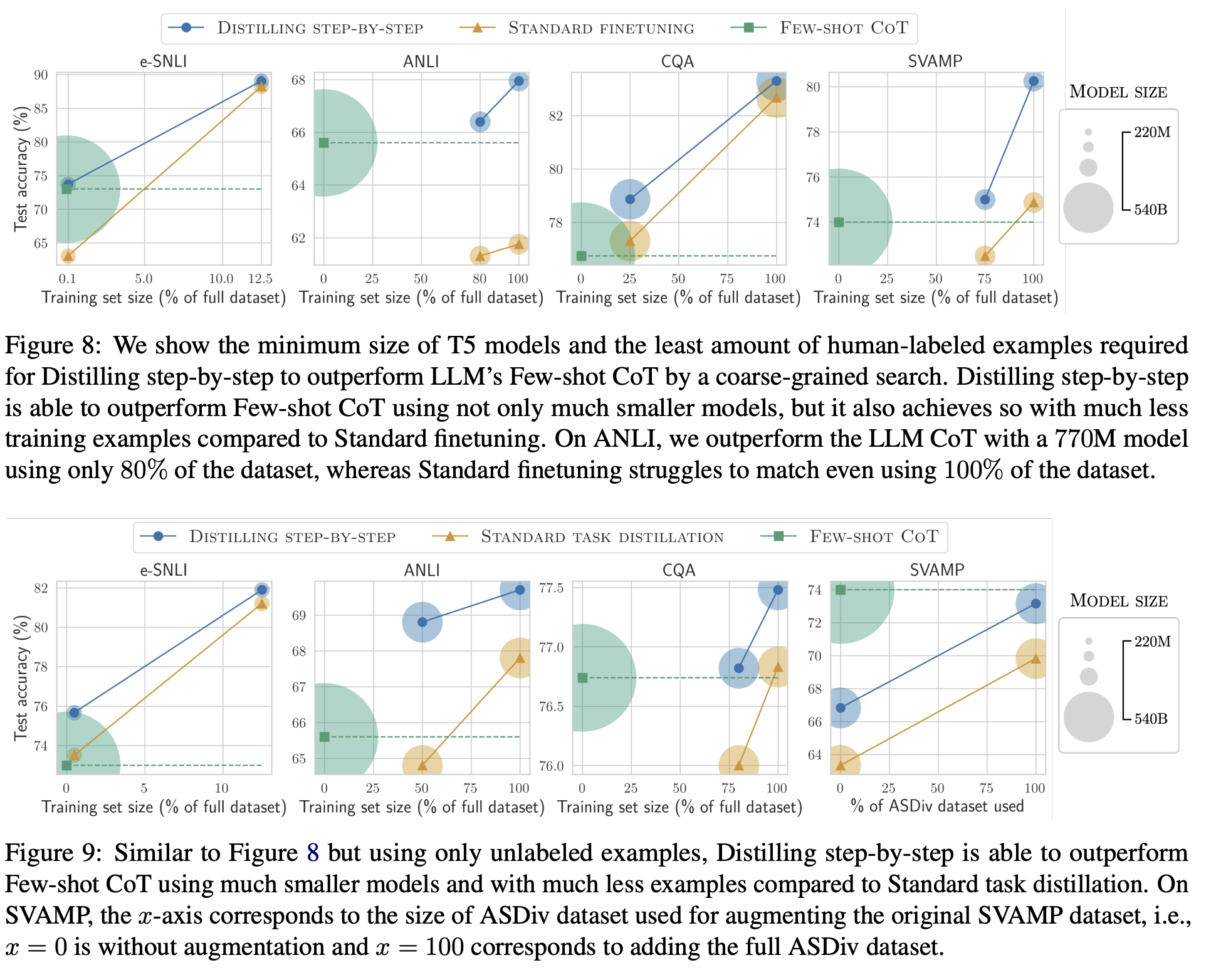 위의 figure(figure 8, human-labeled setting)부터 살펴보자. 우선, distilling step-by-step 방법론이 PaLM few-shot CoT보다 훨씬 작은 model을 사용하고, 전체 training set을 다 사용하지 않았음에도 더 좋은 성능을 내는 것을 확인할 수 있다. 특히, e-SNLI에서는 220M T5와 전체 training set의 0.1%만 사용했음에도 훨씬 좋은 성능을 낸 것을 확인할 수 있다.