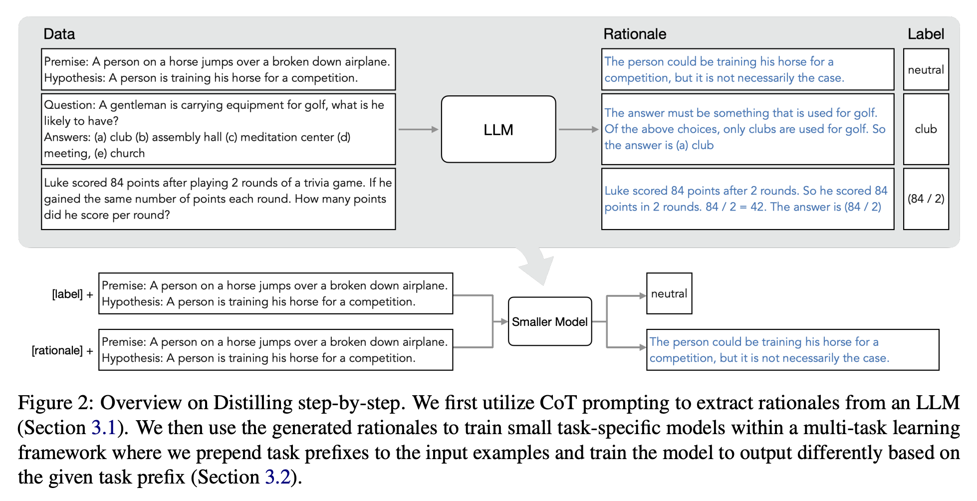 본 논문에서 제안하는 Distilling step-by-step은 LLM의 reasoning 능력을 smaller model 학습에 활용하는 방법론이다. 아래는 Distilling step-by-step의 전반적인 과정을 나타낸 figure이다.