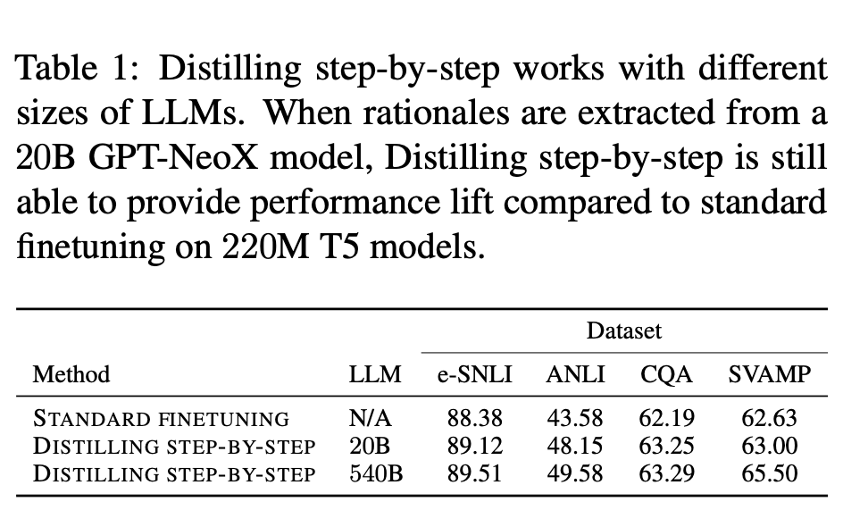 저자들은 Distilling step-by-step의 성능을 측정해보기 위해 다양한 실험을 진행하였다. 이를 통해 아래와 같은 결과를 얻을 수 있었다고 한다