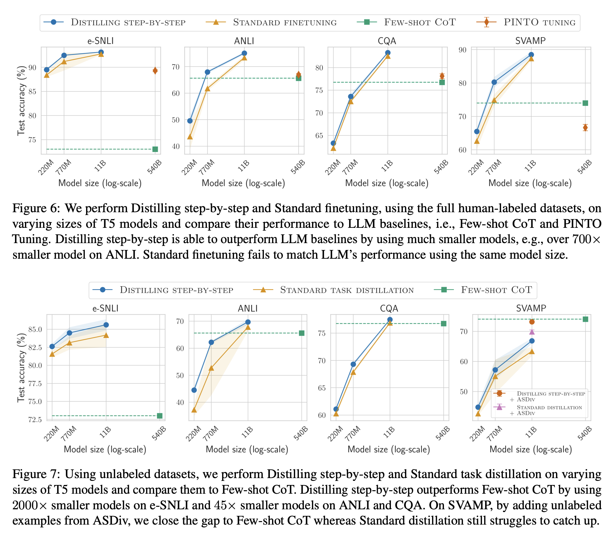 Figure 7은 unlabeled data만 available할 때인데, 이 경우엔 SVAMP를 제외한 dataset에서 LLM(540B)보다 훨씬 작은 크기의 model로도 LLM baseline의 성능을 능가할 수 있었다. SVAMP에서는 distilled model의 성능이 전반적으로 좋지 않았는데, 저자들은 이에 대한 원인으로 SVAMP dataset의 적은 data개수를 지목하였다.